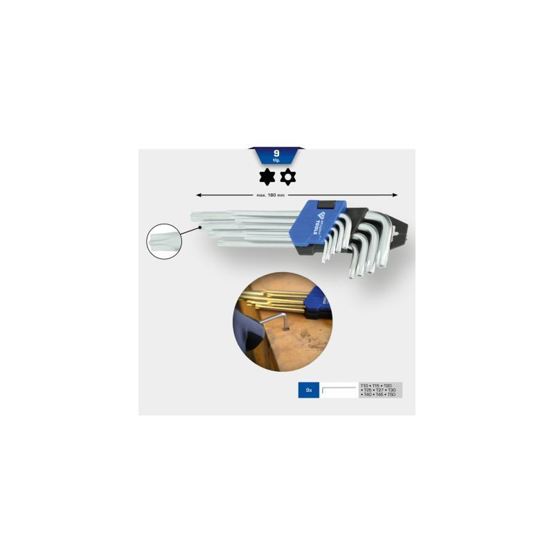Tietoja lyhyesti: Kulmatappiavainsarja, 9-os, Torx®-profiili, lyhytYleiset tiedot: •9-osainen kulma-avainsarja Torx®-ruuveille